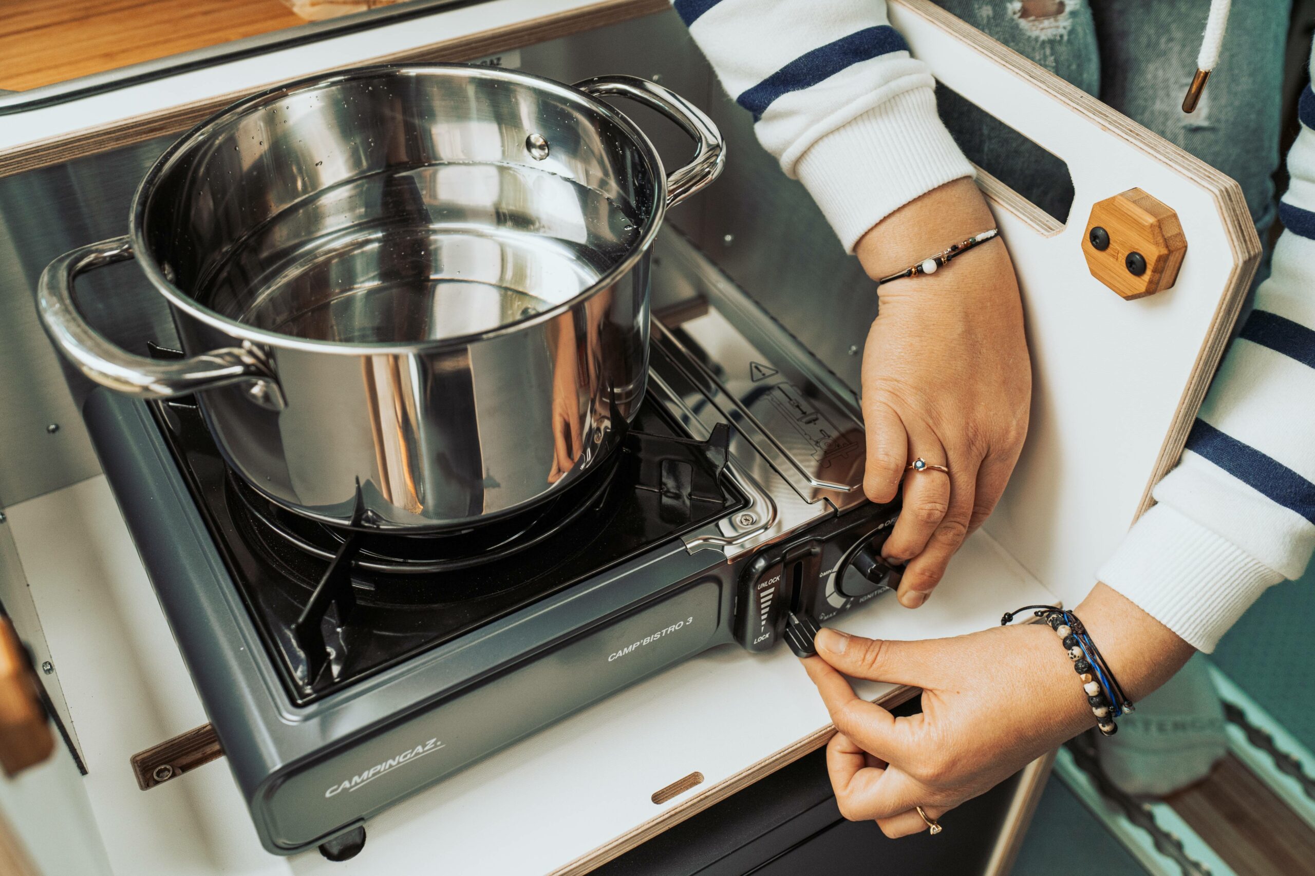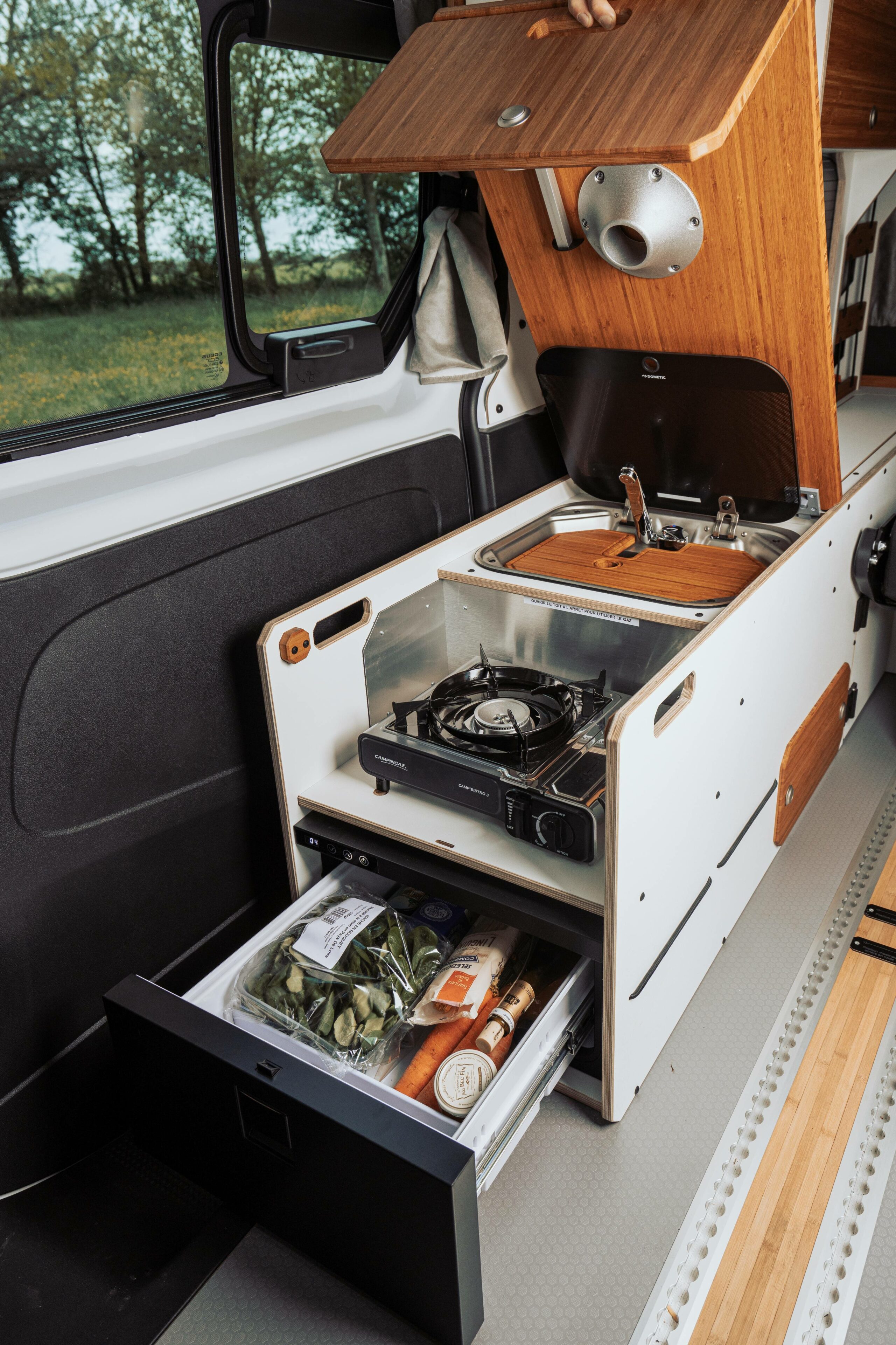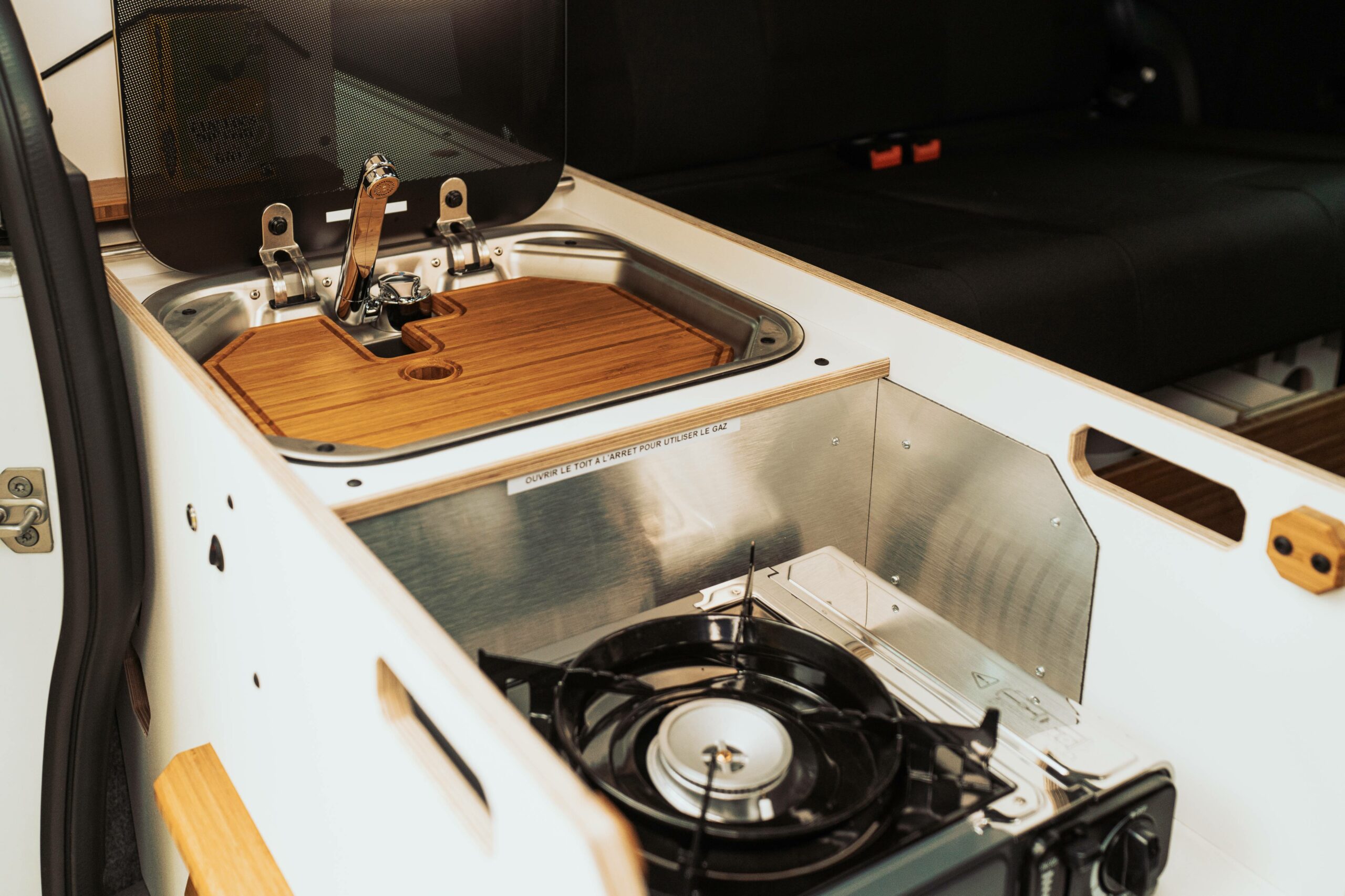 - La cuisine est accessible de l’intérieur comme de l’extérieur. Elle est équipée avec un évier inox, une pompe à eau et un robinet, 2 bidons de 12 L (eau propre, eau usée), un réchaud autonome et portatif intégré dans un tiroir, emplacement frigo (50 L).