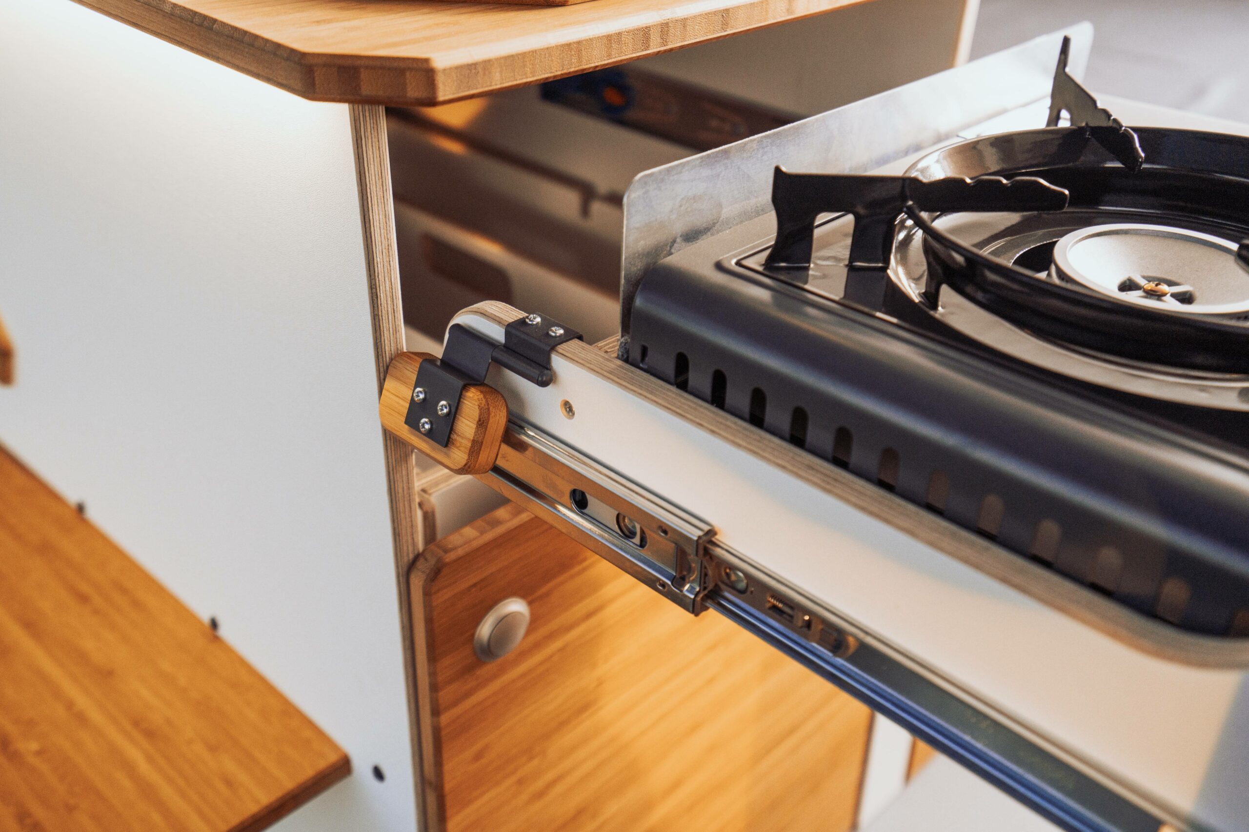 - une cuisine équipée avec un évier inox, une pompe à eau et un robinet, 3 bidons de 12 L (24L eau propre, 12L eau usée), un réchaud autonome et portatif intégré dans un tiroir, des espaces de rangement;