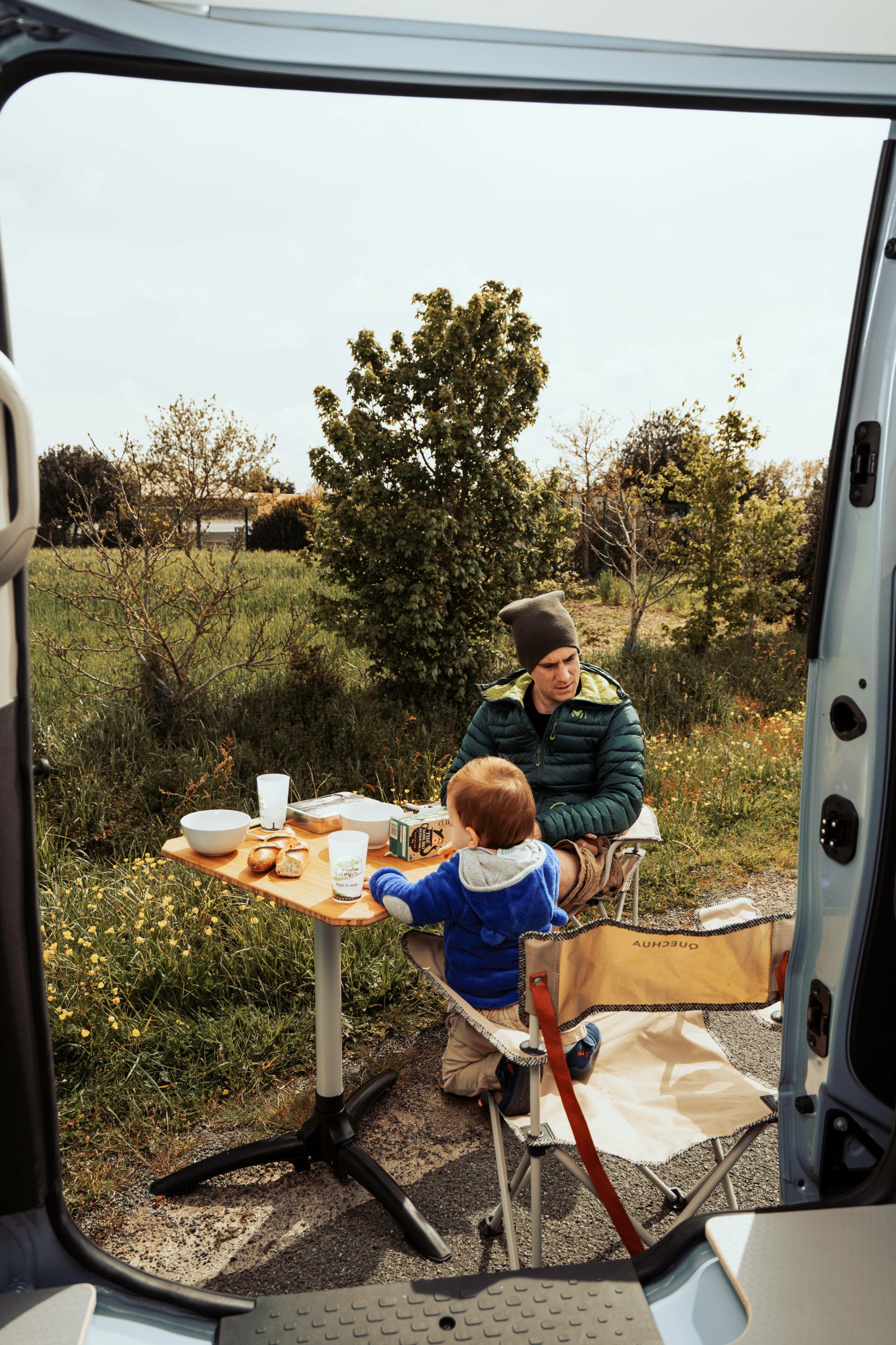 - un meuble haut multi-fonction incluant un emplacement WC chimique accessible de jour comme de nuit et une table sur trépied utilisable à l’intérieur comme à l’extérieur.